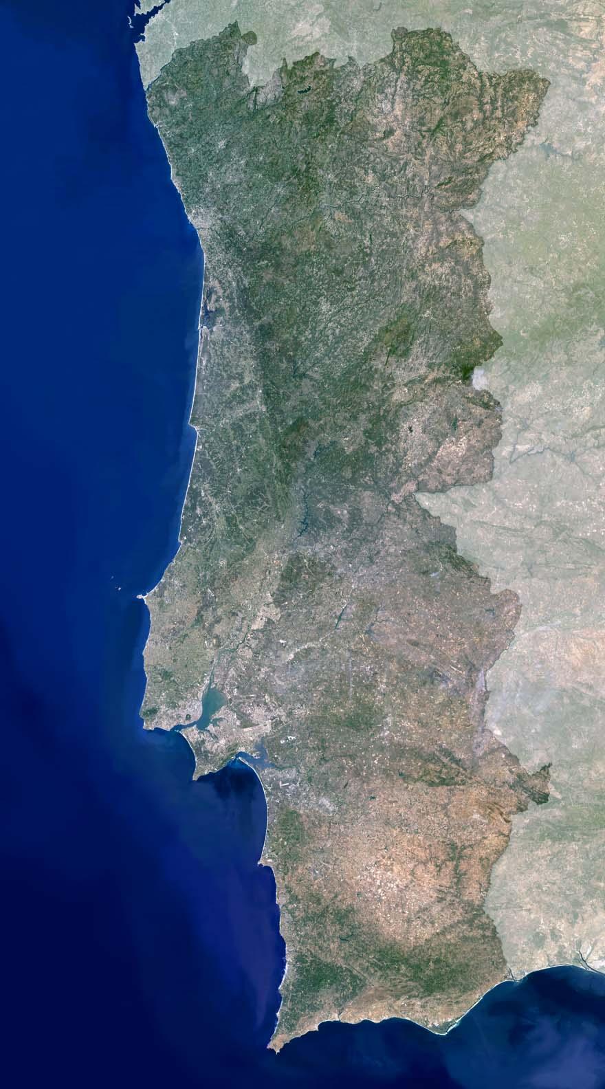 Map of Portugal satellite. Portugal satellite map (Southern Europe - Europe) to print. Portugal satellite map (Southern Europe - Europe) to download. Portugal is a coastal nation in southwestern Europe, located at the western end of the Iberian Peninsula, bordering Spain (on its northern and eastern frontiers: a total of 1,214 km (754 mi)) as its shown in Portugal satellite map. Portuguese territory also includes a series of archipelagoes in the Atlantic Ocean (the Azores and Madeira), which are strategic islands along western sea approaches to the Strait of Gibraltar and the Mediterranean Sea. In total, the country occupies an area of 92,090 km2 (35,560 sq mi) of which 91,470 km2 (35,320 sq mi) is land and 620 km2 (240 sq mi) water.
